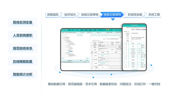 • 量化驗收質量記錄,提高了驗收質量水平:對質量標準進行量化,自動計算檢查項目合格率,自動生成驗收結論,替代人工核算,減少出錯頻率,提高了驗收質量水平;