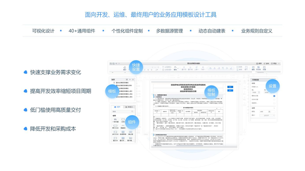 基于可視化編輯的模板生成系統是一個基于可視化設計器,所見即所得的業務應用模板定制平臺。系統集合頁面可視化設計、業務規則配置、數據源管理三大核心能力,用戶無需編寫代碼,通過簡單的拖拽及配置,即可完成符合業務需求的應用模板搭建,避免繁雜的二次開發工作,實現業務需求的隨需而變和快速響應。