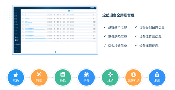 設備全生命周期管理:從設備采購、設備安裝調試、設備使用、設備報廢全過程進行跟蹤,并對設備使用期間的維修、拆除、驗收、移動等所有操作進行記錄,實現設備全生命周期管理。