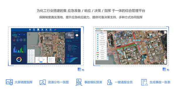 應急指揮平臺以“安全監管、安防監控、監測預警和應急救援四位一體”的建設思路,涵蓋應急值守、資源保障、應急指揮、應急演練、事故模擬、輔助決策等業務模塊,結合GIS地圖、指揮調度平臺、事故模擬算法等手段,保障制度真實落地,為現場提供可靠決策支持,提升應急響應能力,降低事故發生后造成的經濟損失。