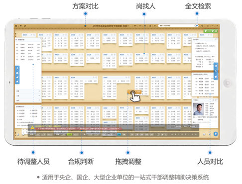 基于移動智能終端的干部調整輔助決策系統,可以代替傳統的線下干部調整工作,將干部信息直觀的展現在pad上,通過簡單的拖拽實現干部崗位的調整,并自動生成調整方案,調整過程中也能查看干部的詳細信息,進行多人比對,同時根據任免規則自動進行合規判斷,不符合規則的會報警提醒。采用該產品可針對性解決干部調整中任免規則多、人員基數大、私密性強等痛點問題,大大減輕干部調整的工作量,輔助用戶合理搭配領導班子。