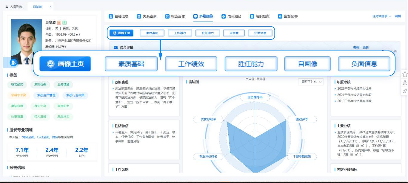 系統(tǒng)創(chuàng)新性建立5維度26要素干部畫像分析模型,從素質(zhì)基礎(chǔ)、勝任能力、工作績效、自畫像、負(fù)面信息5個(gè)維度觀察干部人員,每個(gè)維度又進(jìn)一步細(xì)化考察要素,劃分政治表現(xiàn)、性格特點(diǎn)、工作風(fēng)格、年度考核情況、關(guān)鍵業(yè)績指標(biāo)、后備推薦等26要素,為干部畫像的精準(zhǔn)呈現(xiàn)提供全面信息,輔助領(lǐng)導(dǎo)智慧識才。