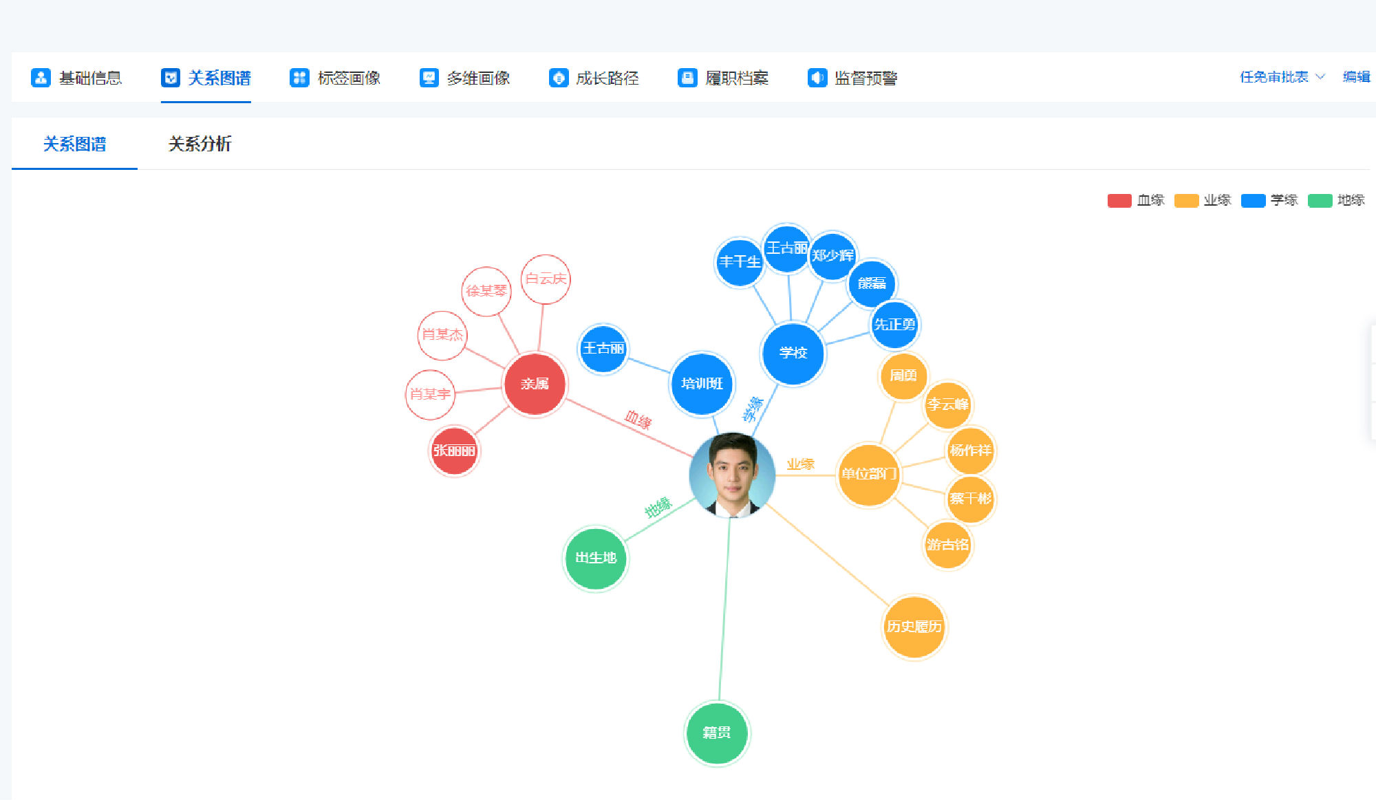 系統(tǒng)基于血緣、學(xué)緣、業(yè)緣、地緣、趣緣維度建立了五緣關(guān)系圖譜,將干部的家庭信息、履職信息、培訓(xùn)學(xué)習(xí)等多維數(shù)據(jù)深度融合,捕獲人與人、人與崗位之間復(fù)雜的共事網(wǎng)絡(luò)信息。例如,一個(gè)干部的妻子是另外一個(gè)干部的妹妹,我們可通過關(guān)系圖譜分析,提示出這兩個(gè)干部存在親屬關(guān)系,為任職回避提供參考。