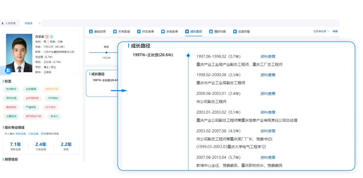 系統(tǒng)根據(jù)干部人員職業(yè)生涯履歷,構(gòu)建履職時(shí)空軌跡畫像,從全程履歷、多層次地理空間、成長發(fā)展等十余個(gè)維度,展現(xiàn)干部人員職業(yè)生涯全景信息,成長路徑一目了然、履職檔案記錄留痕,為精準(zhǔn)以事察人、知事識人、干部交流等工作提供了根本遵循,指明方向。