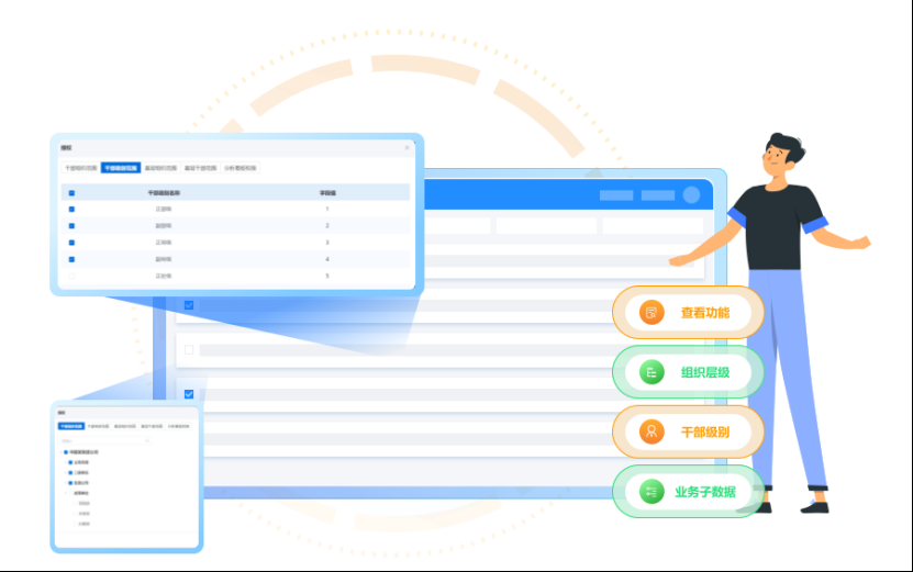 系統提供界面定制選項和細致的權限管理功能,客戶可以自主配置用戶的查看權限,如能查看的功能、組織層級、干部級別、業務子數據等。