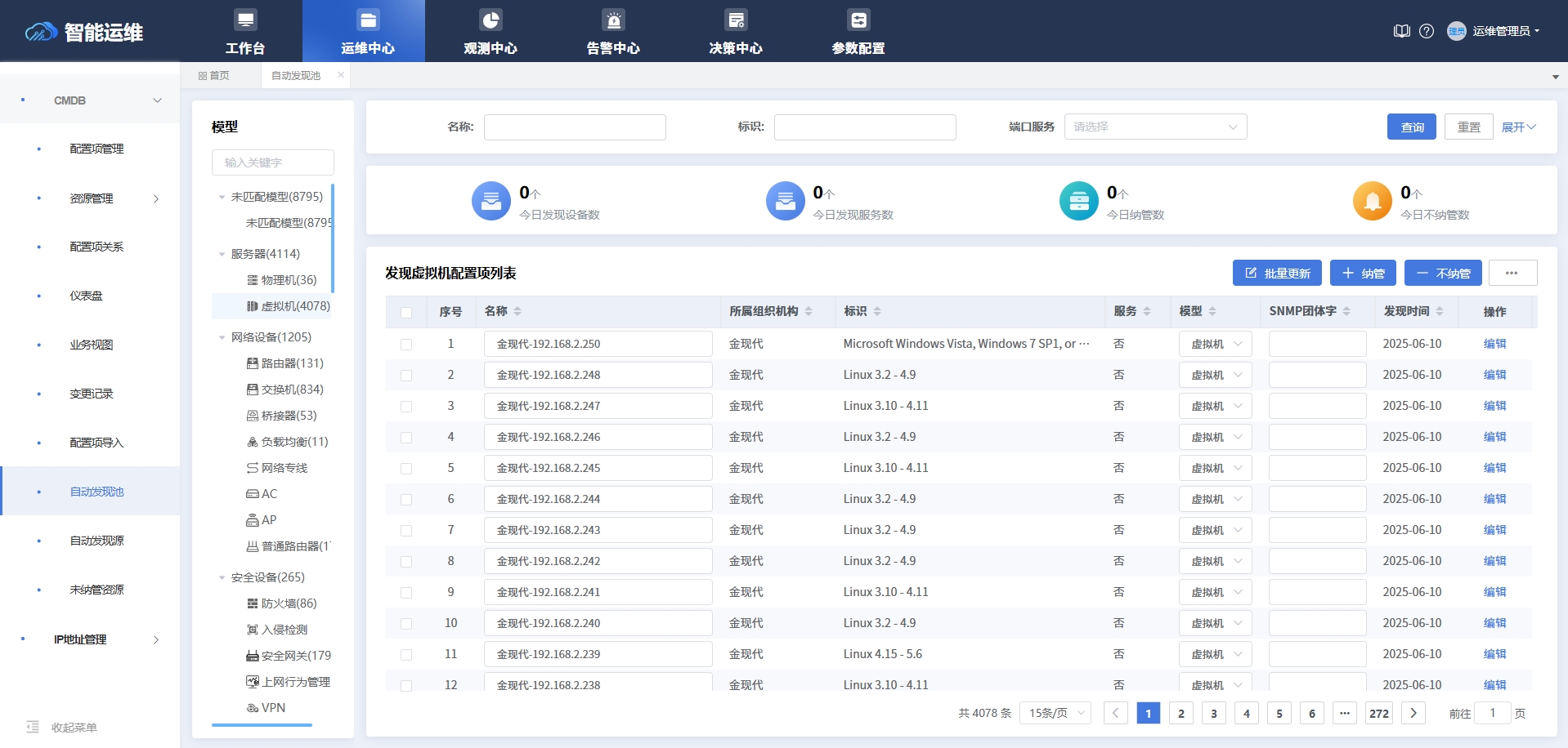 平臺自動掃描網絡資產,抓取設備類型、IP、MAC等信息,一鍵納管,實現既有資產的快速錄入;同時自動識別服務器與網絡、應用與數據庫中間件等資產之間關聯,生成資產關系,實現高效管理。