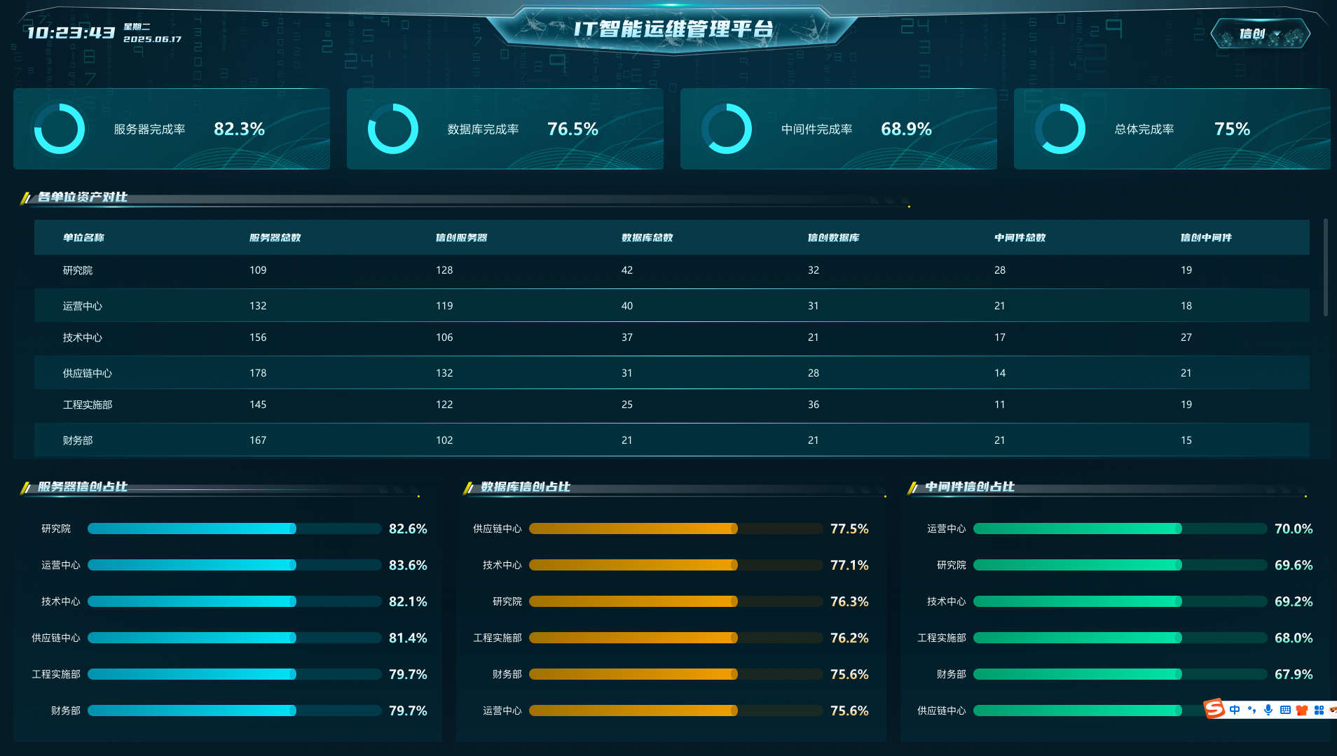 配備動態進度看板,通過可視化圖表實時展示信創資產占比、替換完成度等指標,為信創替代策略制定與成果匯報提供數據支撐,助力企業高效推進信創替代進程。