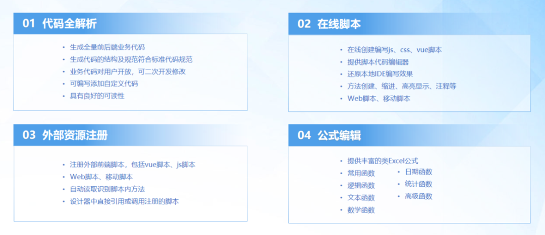 采用 “零 - 低 - 高” 分層開發模式:簡單的表單流程用零代碼快速搭建;80% 的常規業務場景用低代碼覆蓋;剩下20%的復雜邏輯通過開放全量代碼生成、在線腳本注冊等能力突破邊界,做到 “門檻低但上限高”。