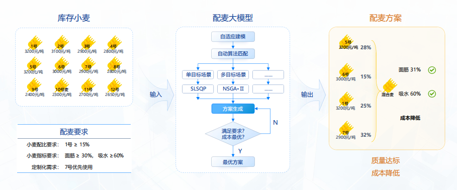 金現(xiàn)代智能配麥依托模型實(shí)現(xiàn)多目標(biāo)優(yōu)化,借助AI優(yōu)化算法,在滿足小麥比例約束與小麥指標(biāo)約束的前提下,精準(zhǔn)算出最優(yōu)用麥比例,兼顧品質(zhì)穩(wěn)定性與成本經(jīng)濟(jì)性。
